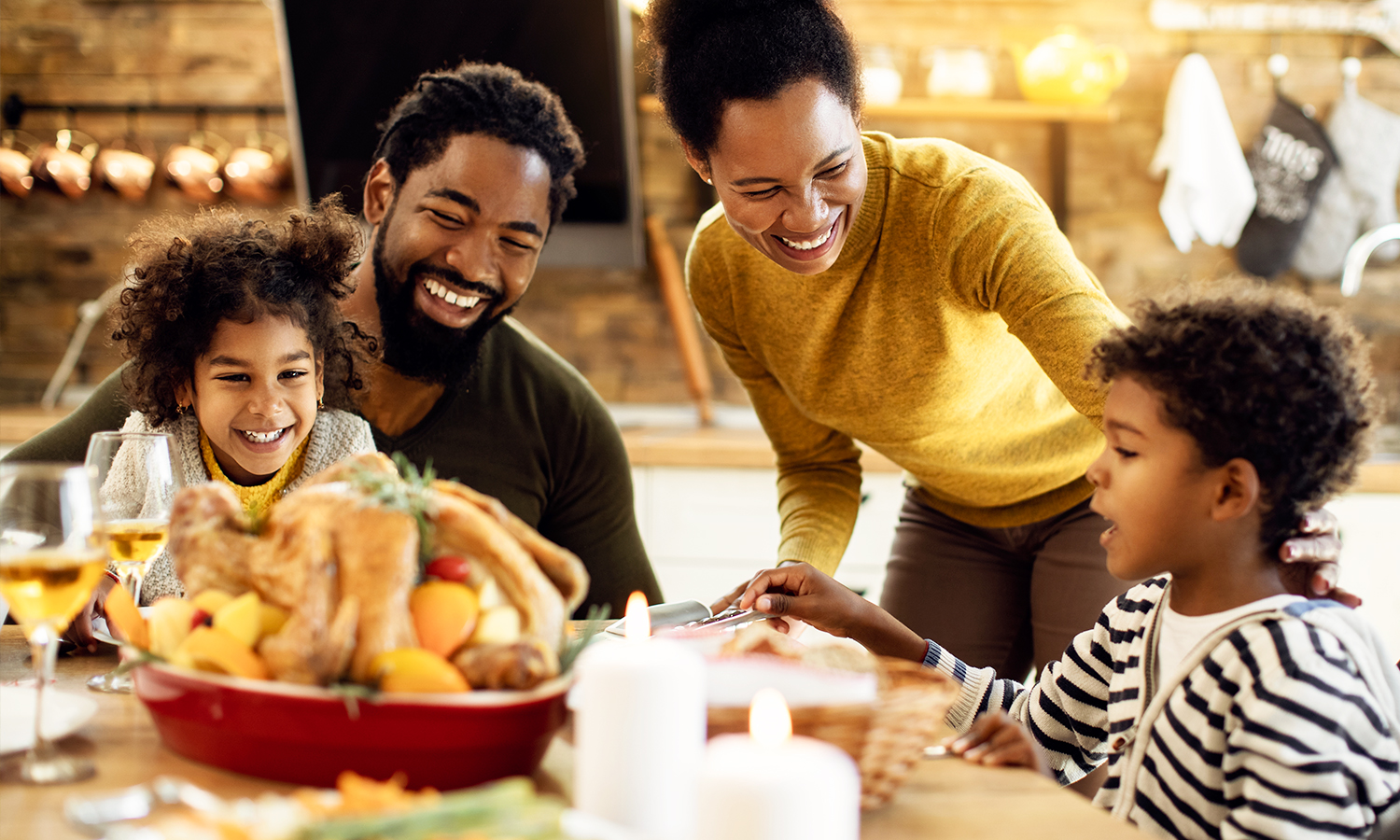 - Time to eat (3:45 p.m.) Carve the turkey at the table or in the kitchen. Fill serving dishes. Light candles. Call everyone to dinner.